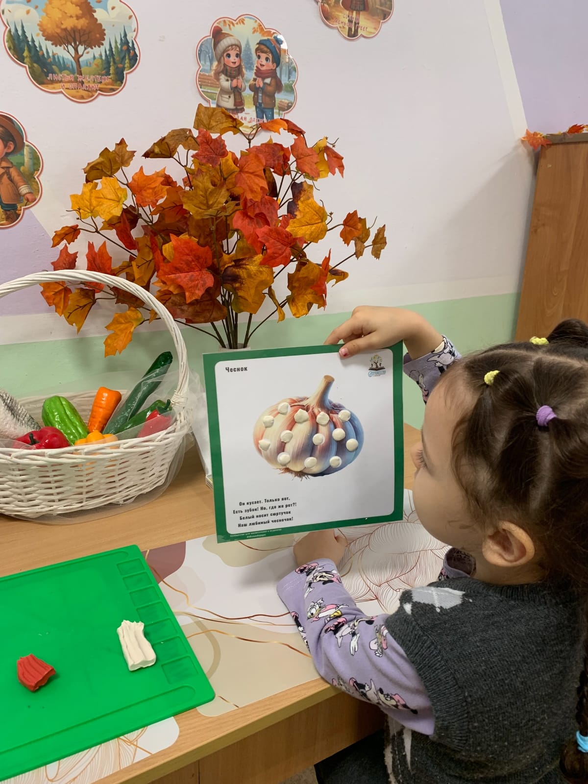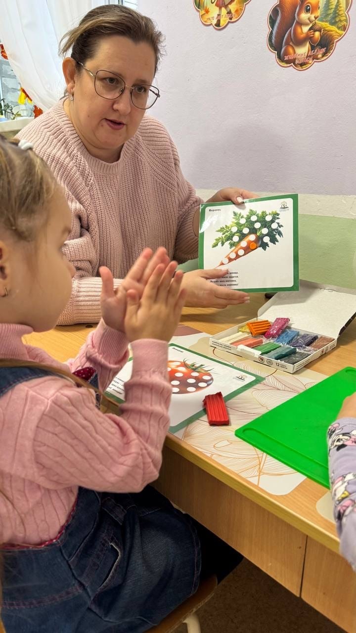 В рамках тематической недели «Овощи» и в целях развития мелкой моторики, воспитанники средней логопедической группы N24 на подгрупповом занятии с учителем-логопедом работали с пластилином. Педагог предложила ребятам игру «Заплатки» на тему «Овощи». Дети самостоятельно подбирали пластилин нужного цвета, отщипывали кусочки небольшого размера, скатывали шарики, а затем делали из них маленькие круглые «лепёшки».