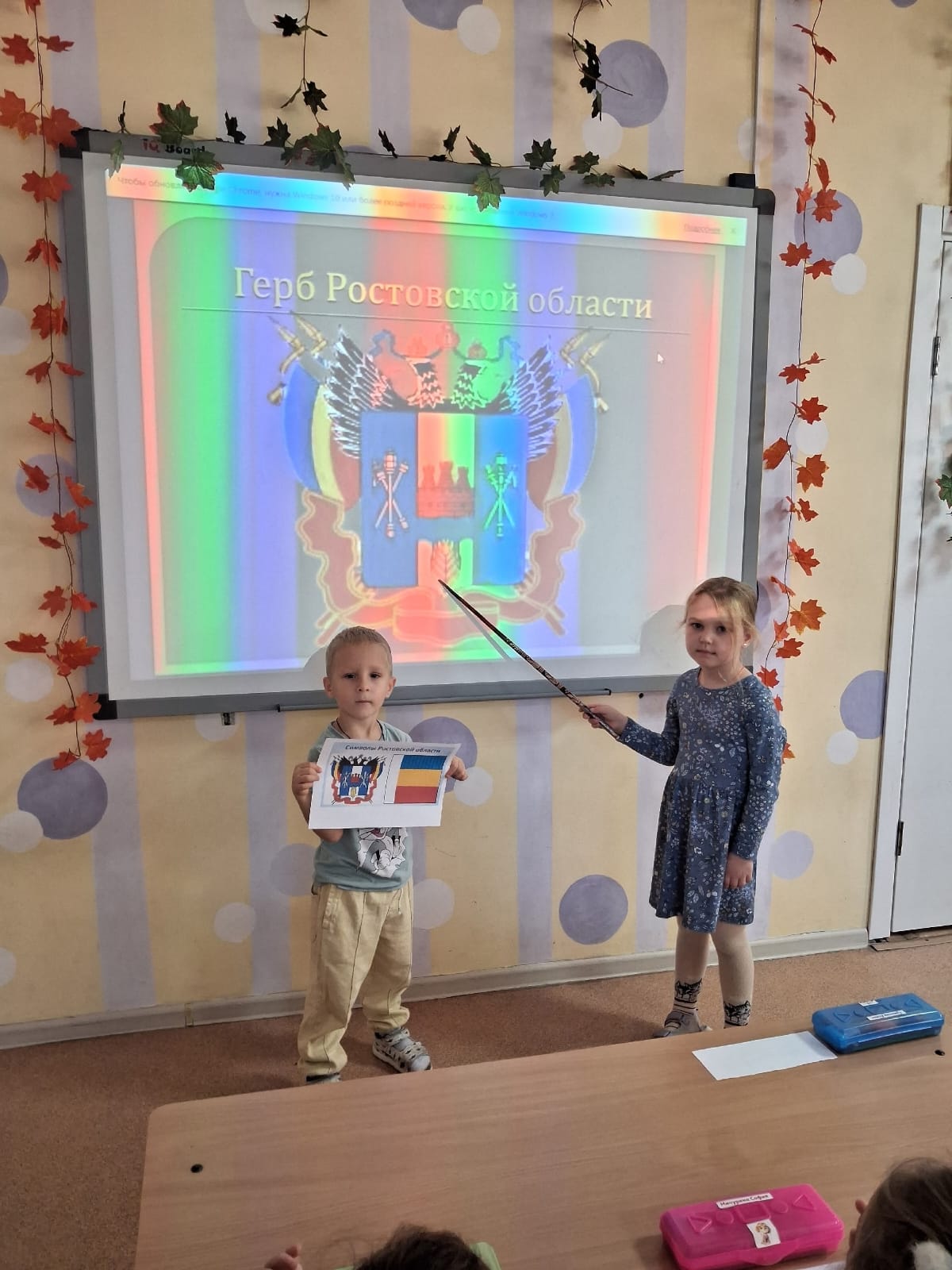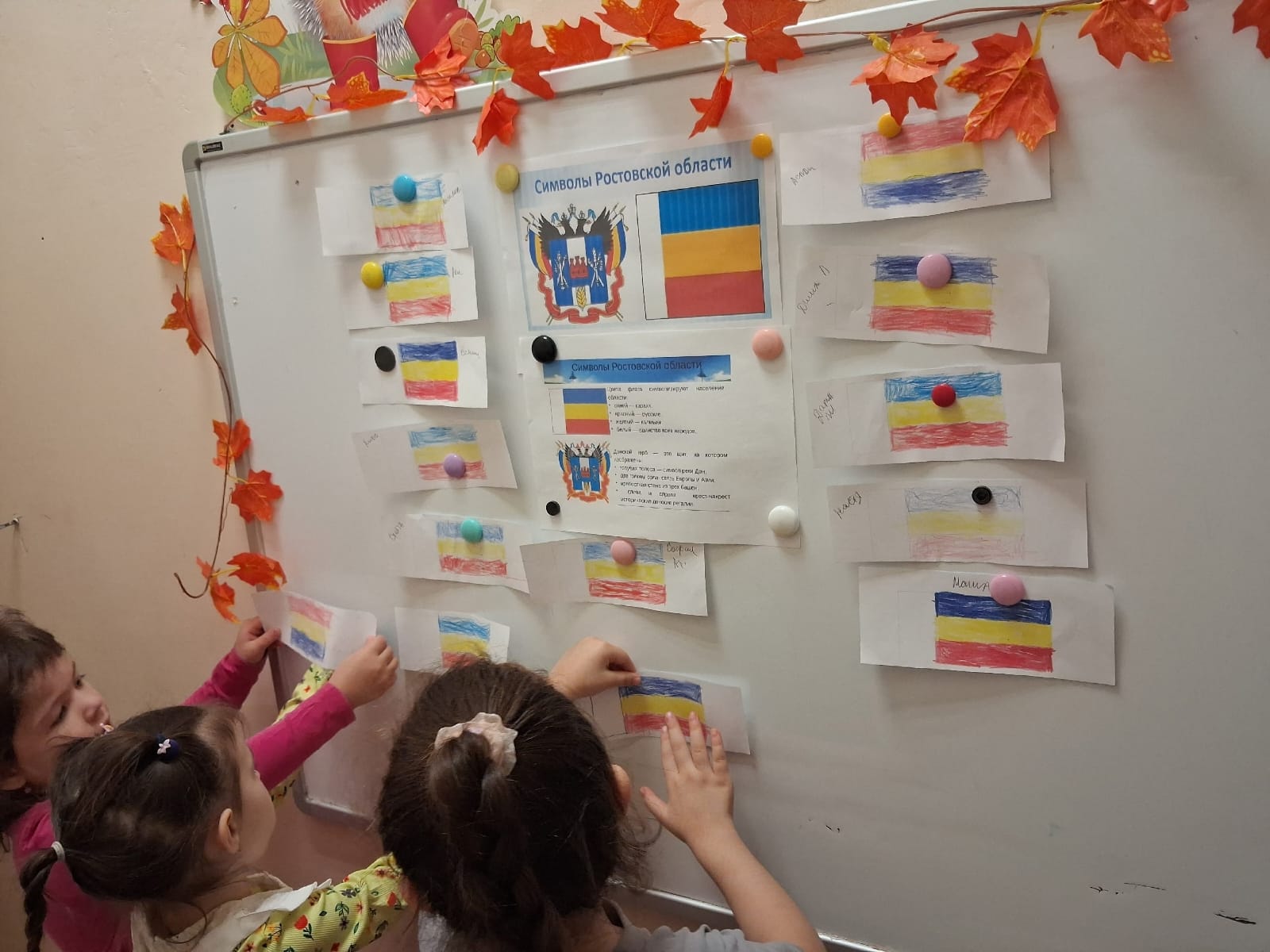 В средней группе №27 (3 корпус) с воспитанниками было проведено тематическое занятие, посвящённое этой дате. Ребята рассмотрели флаг, герб ростовской области, узнали что обозначает каждый цвет и символ на гербе. Разобрали и обсудили различие флага нашей страны, с флагом нашей области.
