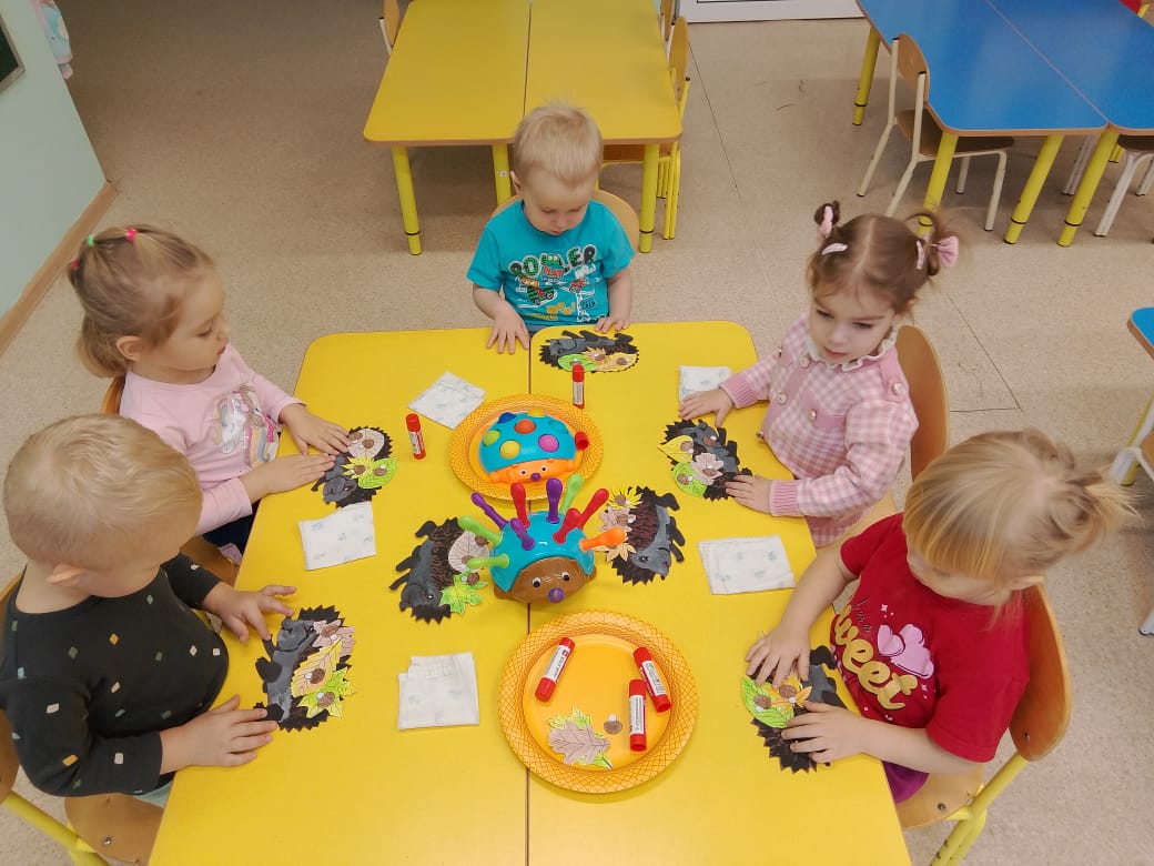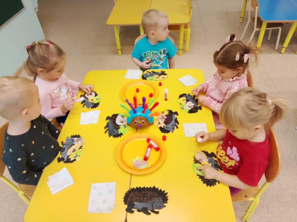 В ясельной группе N12 прошло занятие "Осенний ёжик". Это замечательное занятие, которое сочетает творчество и знакомство с окружающим миром. Дети учились располагать осенние листочки и грибочки на ёжик е, развивая мелкую моторику и аккуратность.