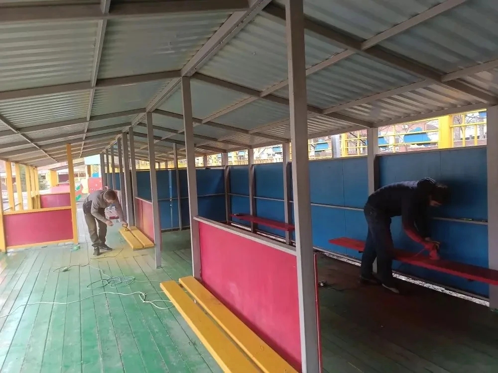 На уличных площадках произведена очистка от старой краски с прогулочных веранд и с малых архитектурных форм. Теперь оборудование уличных площадок готово к окраске.